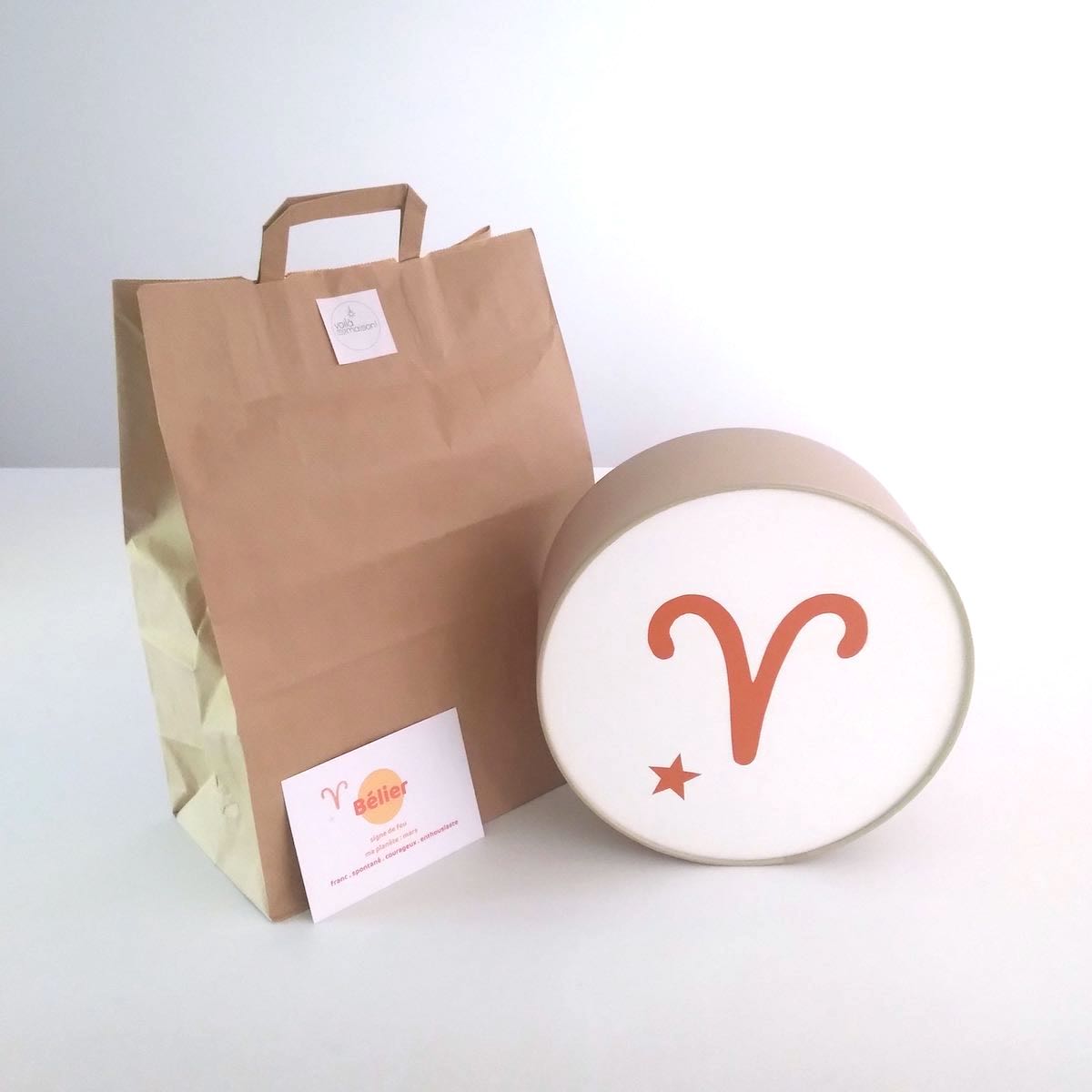 Chaque lampe est accompagnée d'une carte représentant le signe astrologique et un aperçu de ses caractéristiques (format carte postale), le tout glissé dans un petit sac kraft.