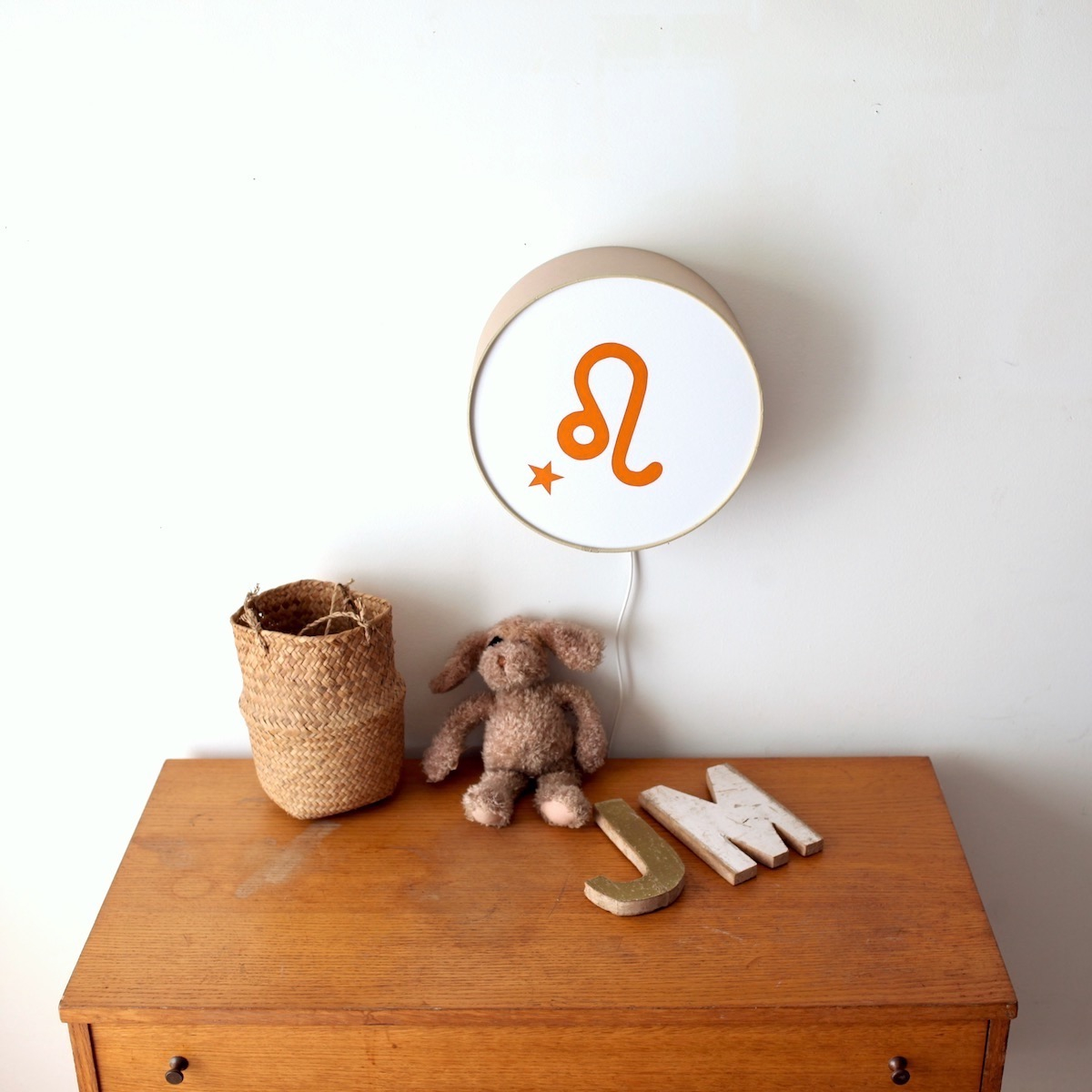 Une lampe enfant zodiaqu e que vous accrocherez en appliqu e lumineuse sur son mur, au dessus d'un commode en bois naturel afin de créer une décoration entièrement personnalisée d'après son signe astro de naissance .