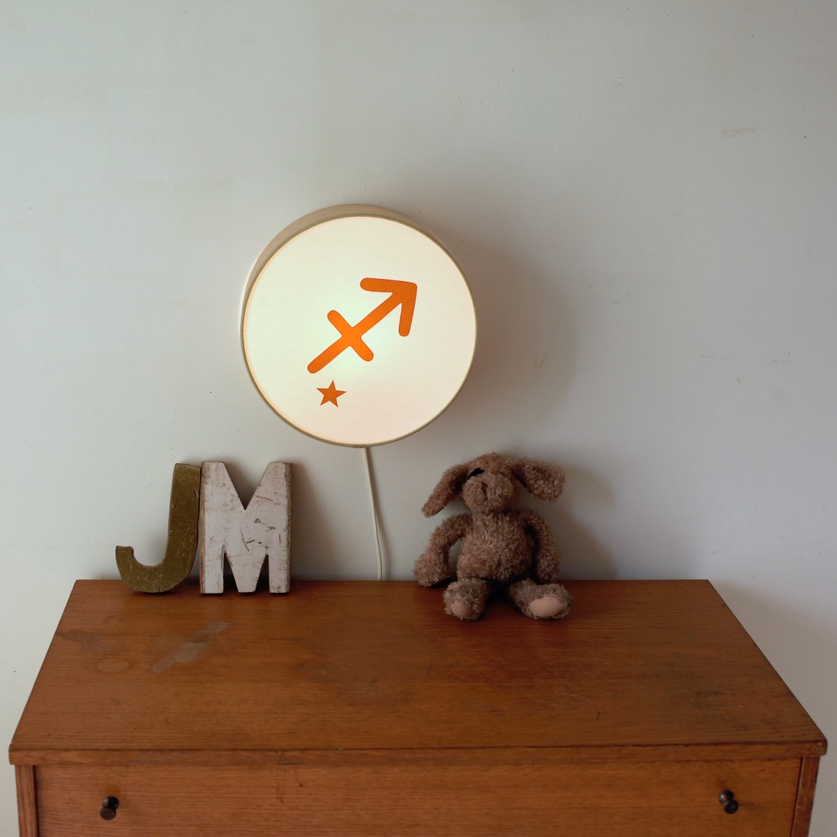 Une lampe enfant zodiaqu e que vous accrocherez en appliqu e lumineuse sur son mur, au dessus d'un commode en bois naturel afin de créer une décoration entièrement personnalisée d'après son signe astro de naissance .