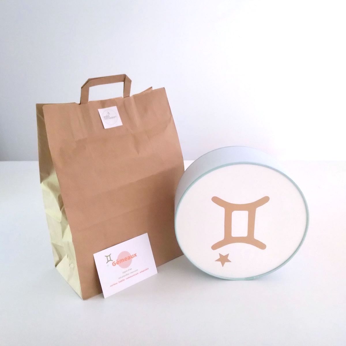 Chaque lampe est accompagnée d'une carte représentant le signe astrologique avec un aperçu de ses caractéristiques (format carte postale), le tout glissé dans un petit sac kraft.