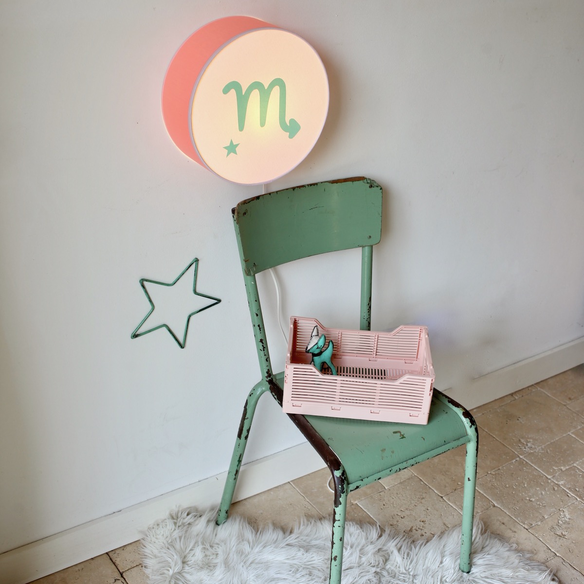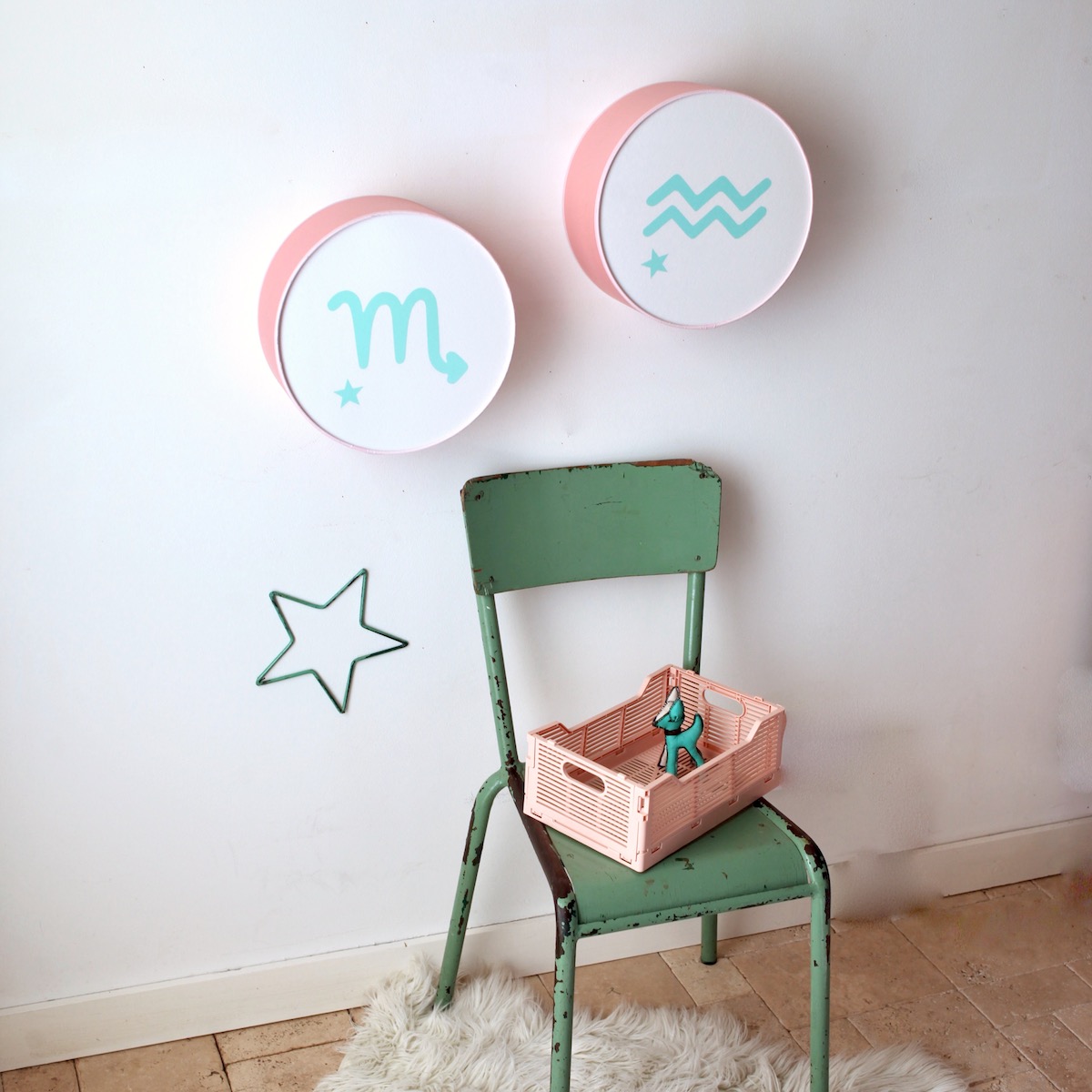 Ce luminaire fille rose personnalisé avec son signe astral donnera du style et du caractère à une chambre avec son abat-jour aux couleurs acidulées . Cette lampe enfant originale est ornée du symbole astrologique décliné en vert pâle et apportera une touche de douceur non dénuée de charme. Fixée sur un mur, cette lampe applique pour chambre de petite fille animera un mur de sa chambre en proposant une décoration enfant bohème et contemporaine . Un objet décoratif et lumineux qui fera l'objet d'un cadeau de naissance exclusif que vous choisirez selon le signe du zodiaque de bébé . Et pour un effet "Waouh", vous pourrez jouer l'accumulation en mixant plusieurs lampes les unes à côté des autres.