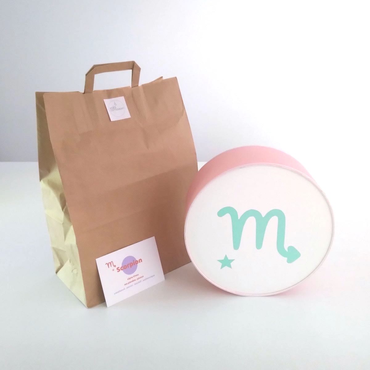 Chaque lampe est accompagnée d'une carte représentant le signe astrologique avec un aperçu de ses caractéristiques (format carte postale), le tout glissé dans un petit sac kraft.