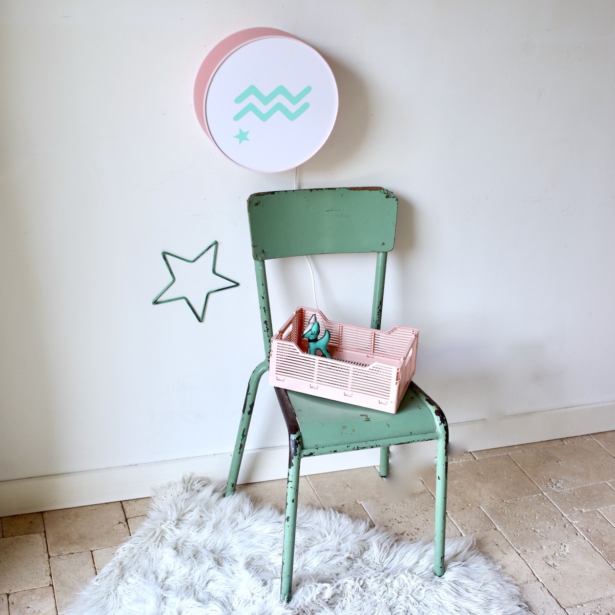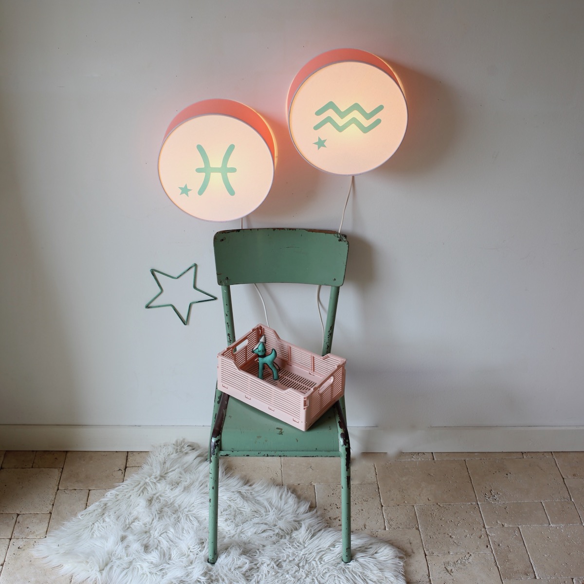 Ce luminaire fille rose personnalisé avec son signe astral donnera du style et du caractère à une chambre avec son abat-jour aux couleurs acidulées . Cette lampe enfant originale est ornée du symbole astrologique décliné en vert pâle et apportera une touche de douceur non dénuée de charme. Fixée sur un mur, cette lampe applique pour chambre de petite fille animera un mur de sa chambre en proposant une décoration enfant bohème et contemporaine . Un objet décoratif et lumineux qui fera l'objet d'un cadeau de naissance exclusif que vous choisirez selon le signe du zodiaque de bébé . Et pour un effet "Waouh", vous pourrez jouer l'accumulation en mixant plusieurs lampes les unes à côté des autres.