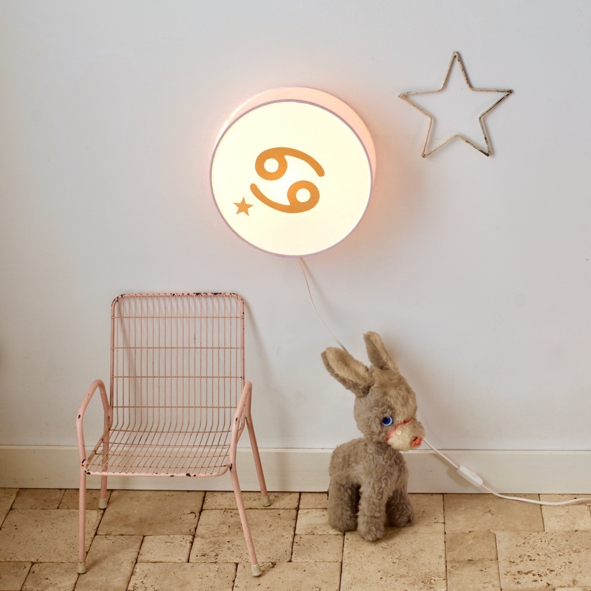 Offrez une lampe bébé fille au ton rose poudré et beige que vous choisirez selon son signe du zodiaque . Un luminaire enfant classique et intemporel sur la thématique astrologique , qui s'harmonisera à la déco de sa chambre et apportera une douce et réconfortante lumière.
