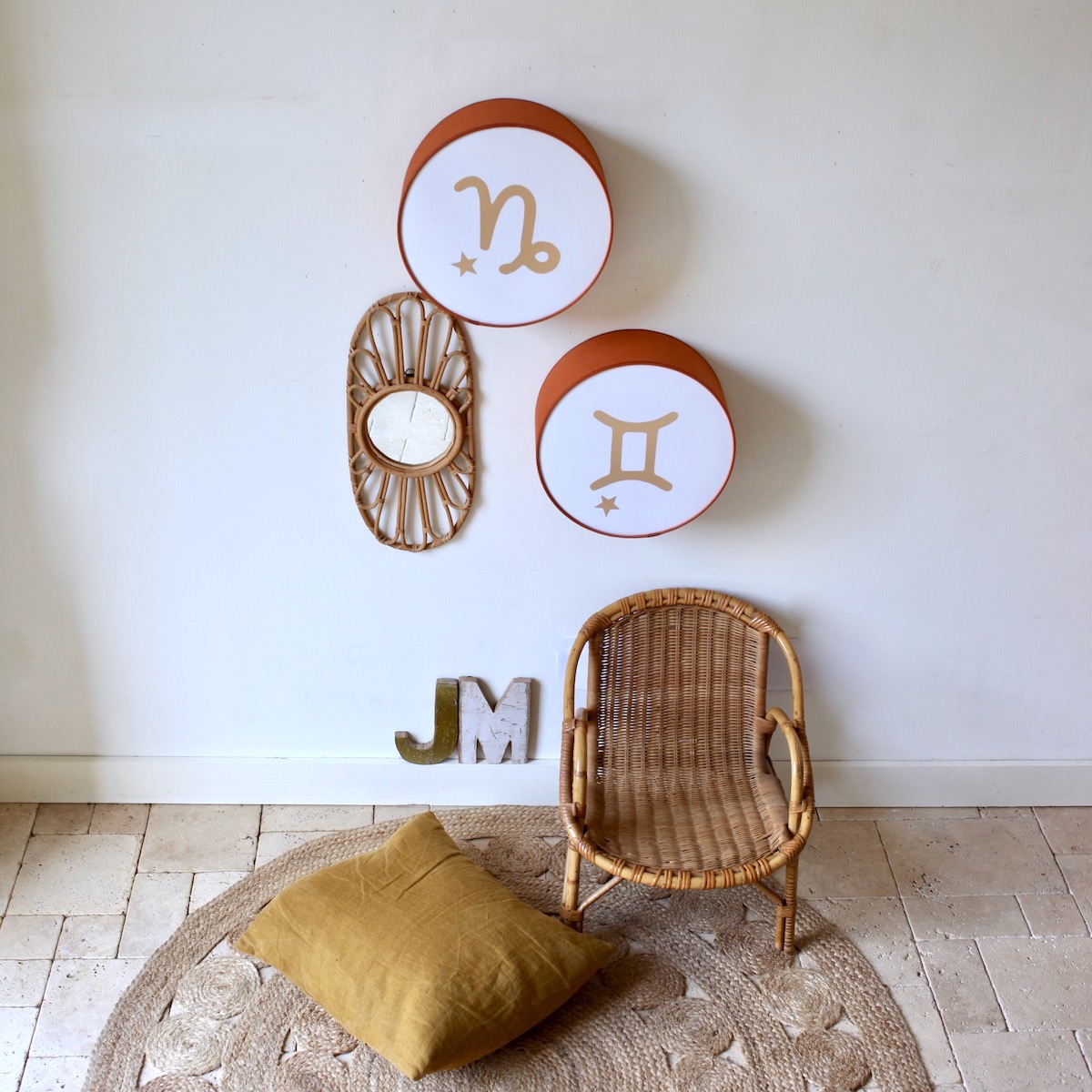 Les chambres des tout petits adoptent des teintes naturelles avec cette lampe bébé terracotta et beige pour une déco douce et intemporelle . Ce luminaire enfant design est personnalisé selon le signe du zodiaque de votre bambin . L'abat-jour est orné de son symbole astrologique stylisé , décliné dans un beige chaude et vibrant.