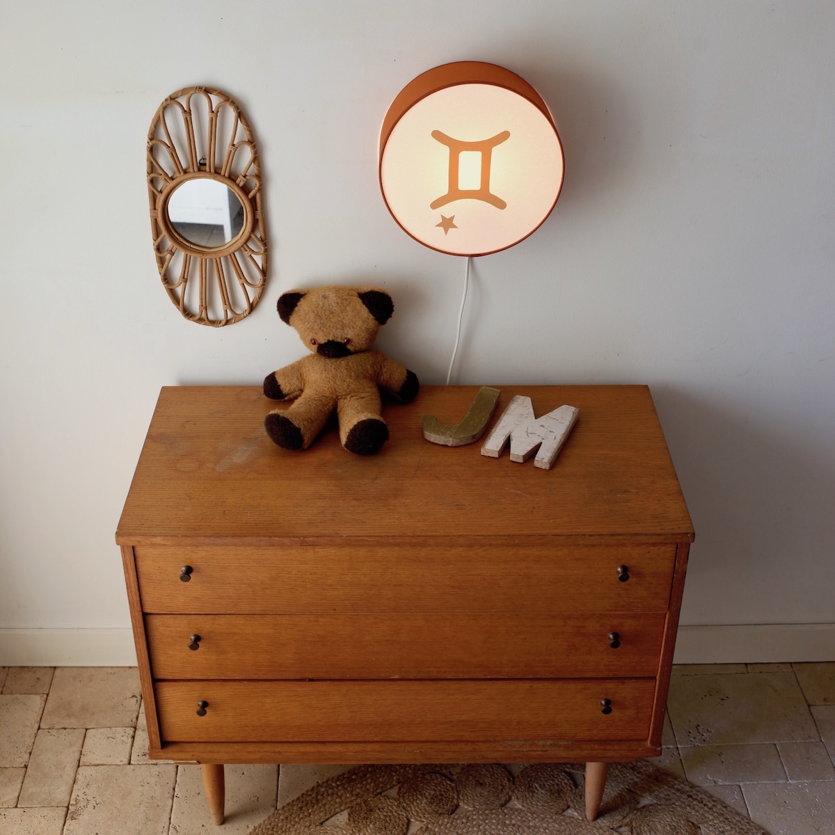 Les chambres des tout petits adoptent des teintes naturelles avec cette lampe bébé terracotta et beige pour une déco douce et intemporelle . Ce luminaire enfant design est personnalisé selon le signe du zodiaque de votre bambin . L'abat-jour est orné de son symbole astrologique stylisé , décliné dans un beige chaude et vibrant.