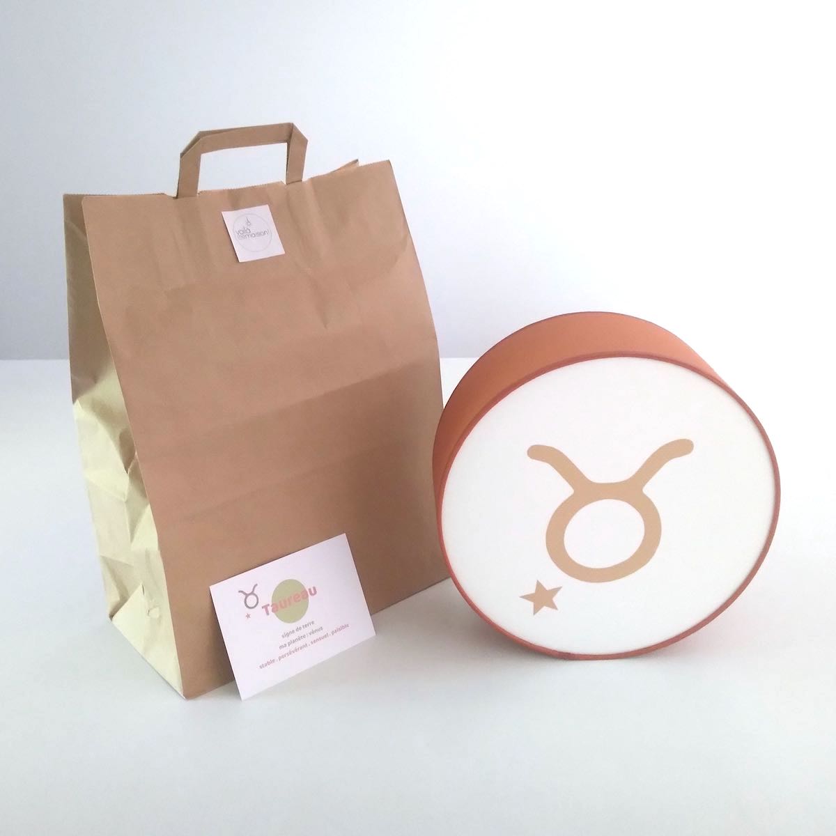 Chaque lampe est accompagnée d'une carte représentant le signe astrologique avec un aperçu de ses caractéristiques (format carte postale), le tout glissé dans un petit sac kraft.