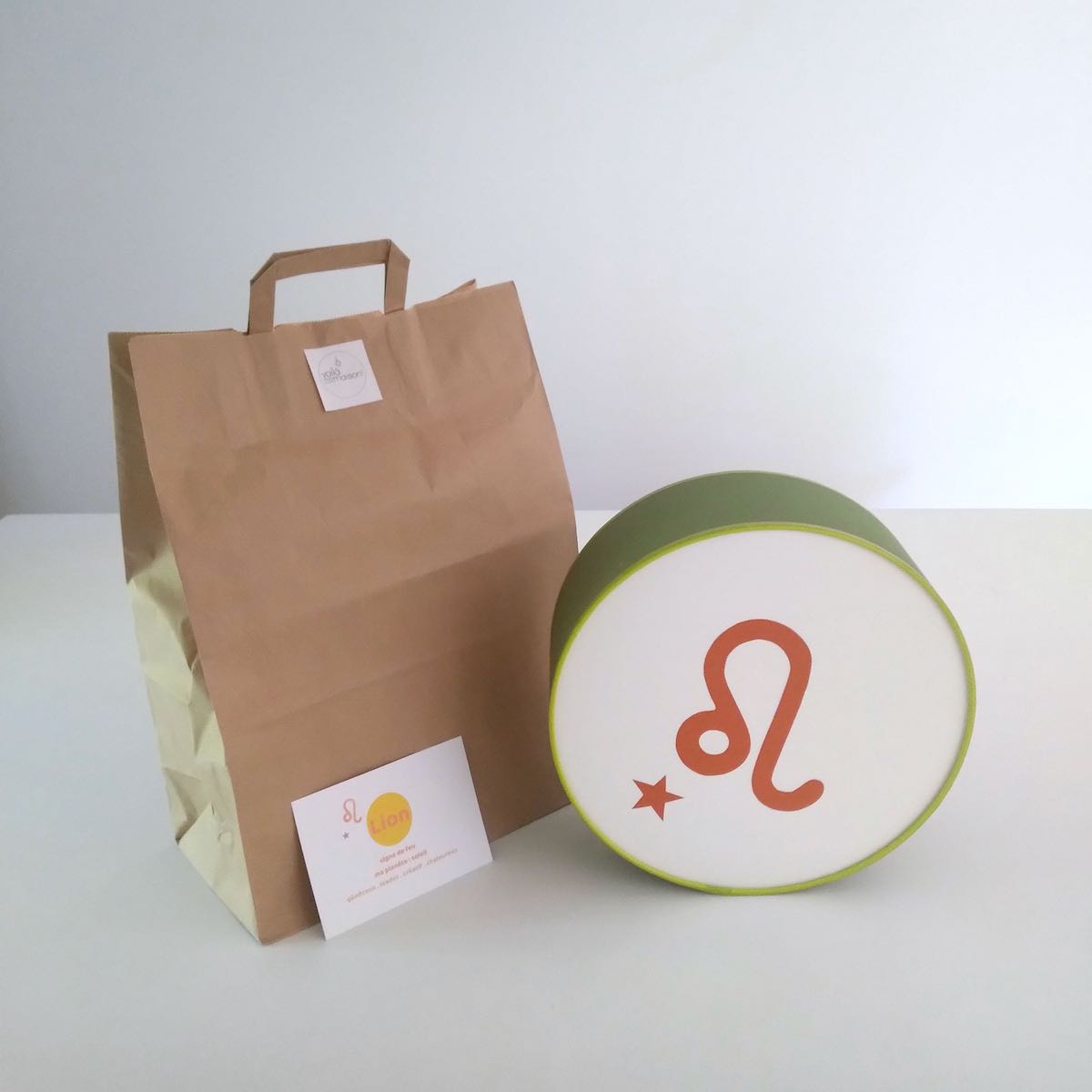 Chaque lampe est accompagnée d'une carte représentant le signe astrologique avec un aperçu de ses caractéristiques (format carte postale), le tout glissé dans un petit sac kraft.
