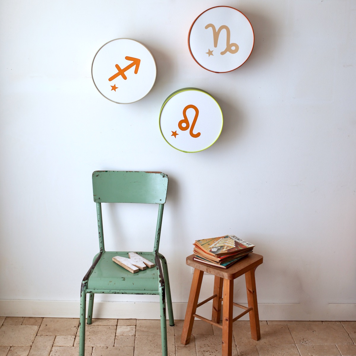 Pour un enfant né sous le signe du Lion , du Bélier , du Capricorne , etc. Je vous propose une collection de lampes astrologiques junior personnalisées décoratives qui feront l'objet d'un cadeau de naissance ou d'anniversaire . Un luminaire chic et coloré pour les petits explorateurs en herbe , qui s'harmonisera dans une déco sur le thème jungle avec ces tons vert et orange terracotta .